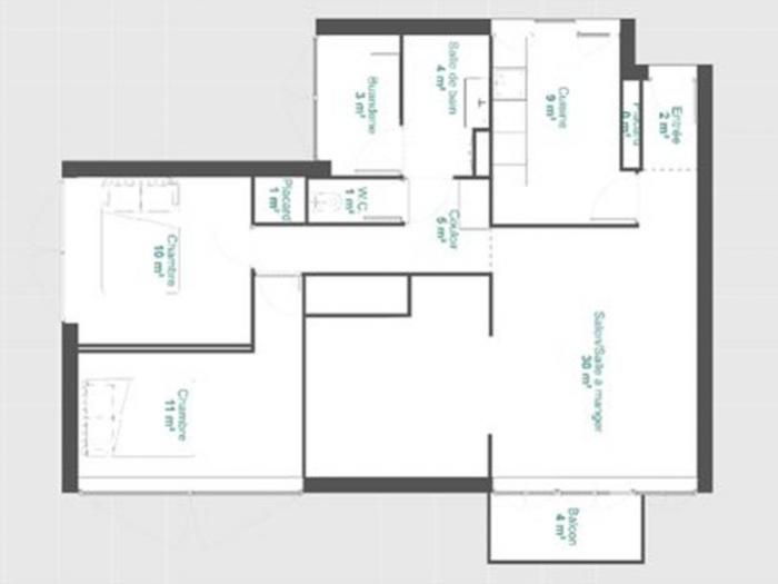 Une entrée avec placard, une cuisine équipée neuve (plaque induction, hotte, ensemble de meubles et rangements, emplacement four et lave-vaisselle), un grand salon double (possible 3ème chambre) avec balcon, une salle d'eau neuve avec douche italienne et grand meuble vasque, une buanderie indépendante, des WC séparés, ainsi qu'un couloir avec deux grands placards, et 2 belles chambres lumineuses.