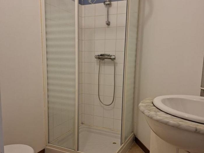Une pièce de vie lumineuse avec cuisine équipée, ainsi qu'une salle de bain avec douche et WC.
