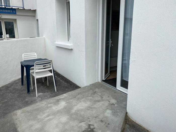 A l’extérieur, une cour avec salon de jardin (table et chaises).