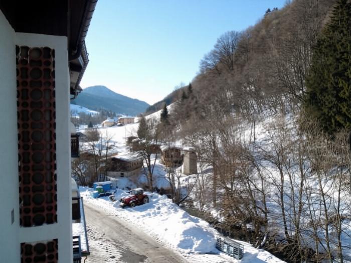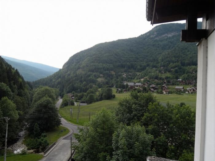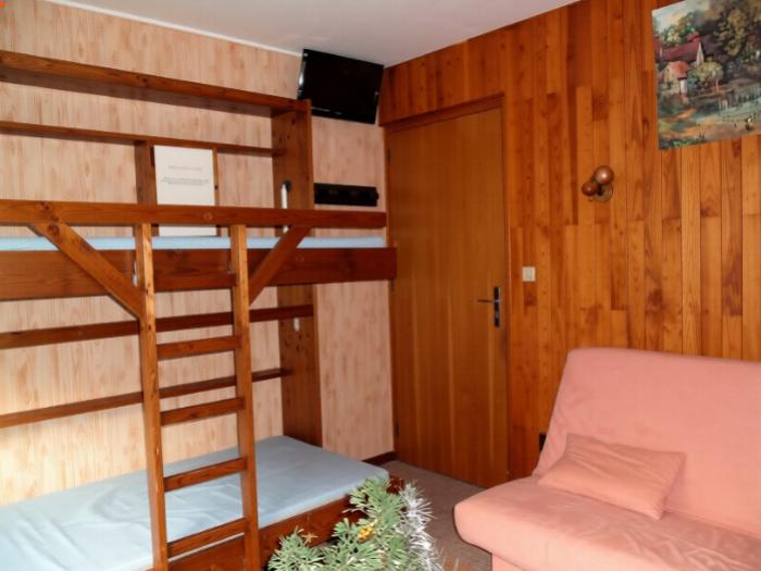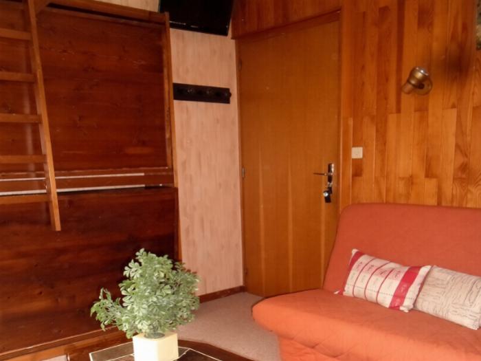 Salon (clic-clac + 2 lits superposés) donnant sur petit balcon: vue forêt/torrent, TV écran plat, petite cuisinette équipée, salle d'eau.