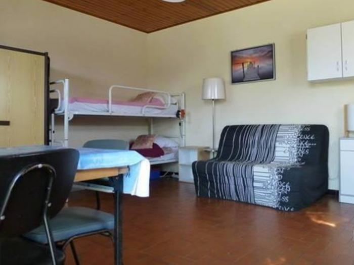 Agréable studio disposant d'une belle pièce à vivre avec une banquette lit 2 personnes et 2 lits superposés armoire-buffet et télévision. Coin cuisine avec tout le nécessaire (plaques électriques, four, frigidaire, micro-ondes…), salle de douches avec toilettes.
