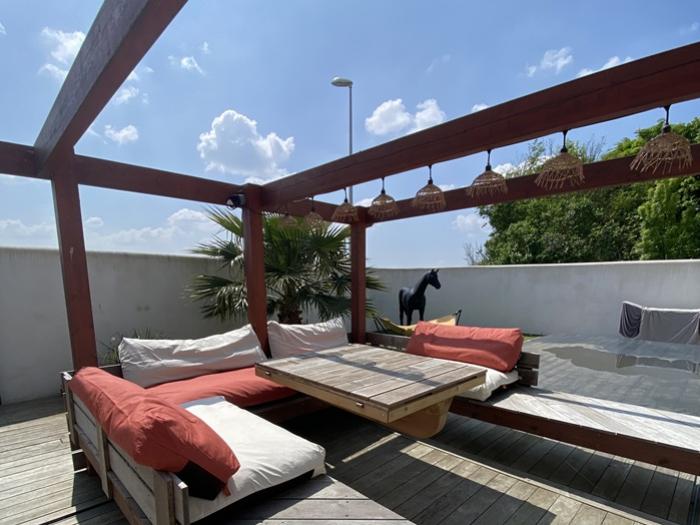Patio de 200 m² avec mini-piscine. Terrasse coulissante (mobile) couvrant la piscine.