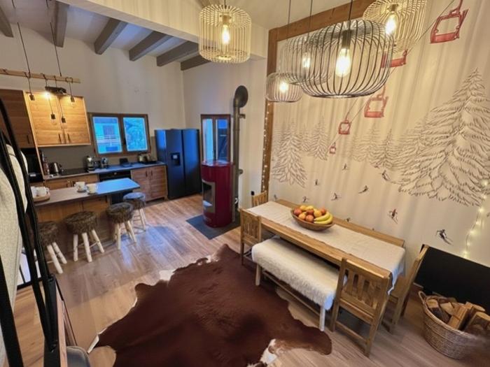 - Une vaste pièce de vie (belle hauteur sous plafond) : cuisine ouverte entièrement équipée, salle à manger avec grande table extensible (pour 14 convives).
