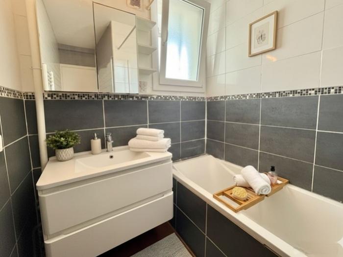 - Une salle de bain avec baignoire