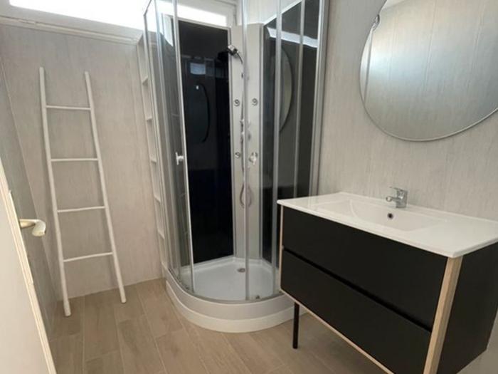 - Une salle de bains rénovée avec douche, rangements, lambris muraux et carrelage au sol.