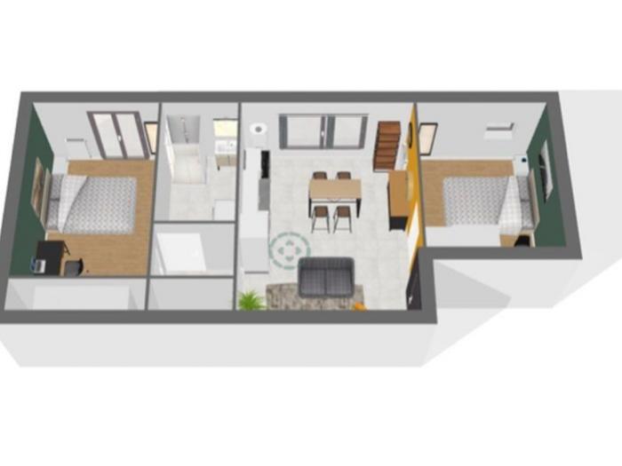 2 chambres, une salle de bain, une cuisine équipée ouverte sur le séjour.