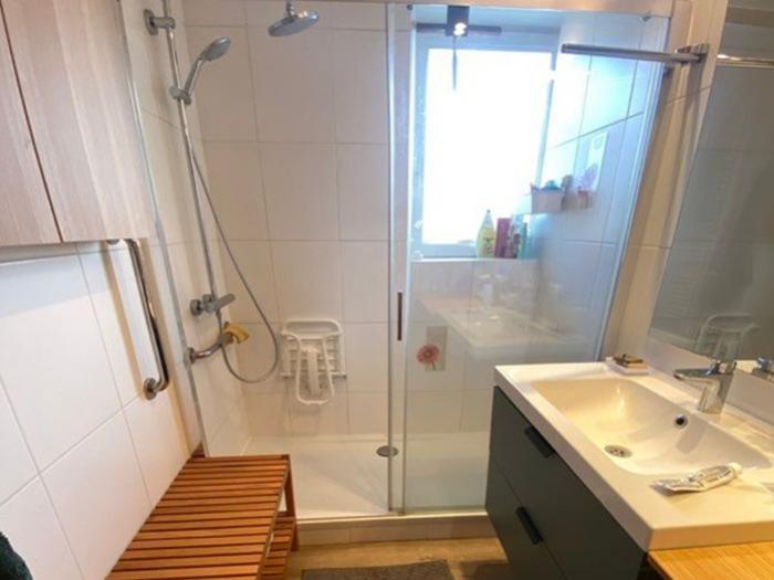 Une grande entrée + placard (14 m²), une cuisine équipée (11 m²), un salon salle à manger (25 m2), une salle de bain récente, 2 chambres (17 et 23 m²) et un Wc (1,5 m2).