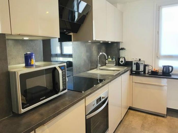 Une entrée avec placard, une cuisine moderne et entièrement équipée, un double séjour donnant sur un balcon exposé plein sud, une chambre, une salle d’eau et des toilettes séparées.