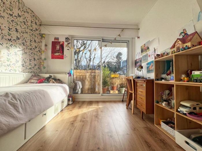 - 3 chambres (12 m² / 12 m² / 14 m²), avec placards intégrés et balcon
