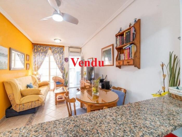 Orihuela Costa (03189) : Vente bel appartement 3 pièces, d'une superficie de 47 m2 habitables en Surface utile (Surface construite 54 m2), situé sur le secteur prisé de la Zenia, à seulement 500m de la mer Méditerranée. Un charmant appartement meublé, climatisé, situé au 1er étage d'une résidence. Il comporte :