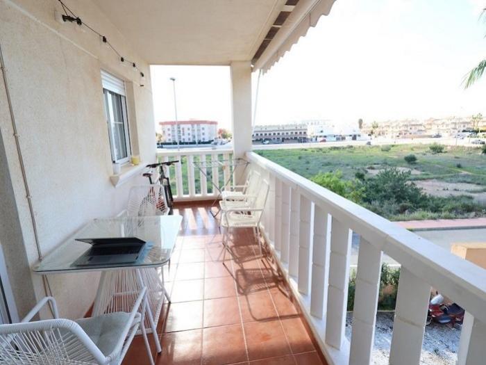 Orihuela Costa (03189) : Sur la Costa Blanca, vente d'un bel appartement en angle, exposé Sud, avec 3 pièces, bien situé, à 2 km de la mer et des plages, sur le secteur recherché de Cabo Roig. Un appartement lumineux, fonctionnel, et meublé, d'une superficie de 83 m² (construits), à l'étage d'une charmante résidence dotée de deux piscines communes, et d'espaces verts. Il se compose comme suit :