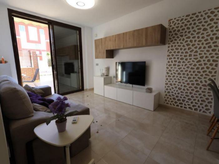 A vendre charmant appartement rez-de-chaussée de 3 pièces, prêt à emménager, avec jardin carrelé, situé sur le quartier de Lomas de Cabo Roig, à 1500 mètres de la mer et des plages. Un bungalow, contemporain, meublé, climatisé, d'une superficie de 64 m² habitables, au sein d'une agréable résidence avec piscine commune. Il est agencé comme suit :