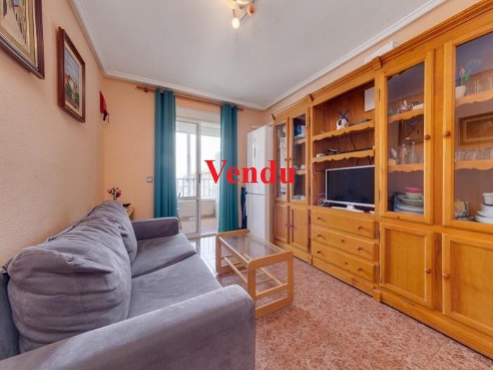 Torrevieja (03180) : Vente charmant T3 dernier étage, orienté Nord-Ouest, d'une superficie de 49 m² habitables en Surface utile (Surface construite 56 m²), situé dans un quartier central, proche du parc urbain de las Naciones, à 800 m de la mer et des plages. Un appartement meublé, équipé, climatisé, au 5ème et dernier étage d'une résidence avec piscine commune, espaces verts et ascenseur. Il comprend :