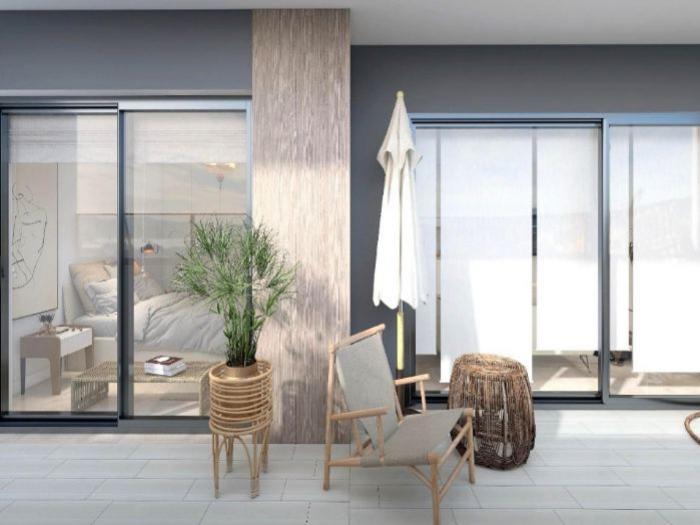 Vente d'un bel appartement T2 neuf, contemporain, orienté Sud, d'une superficie de 45 m² (surface construite 51 m²) idéalement situé dans le cœur de ville, à seulement 200 de la mer et de la Plage del Cura. Un appartement bien agencé, au sein d'une résidence élégante avec ascenseur, solarium commun, jacuzzi et espace détente. Il présente :
