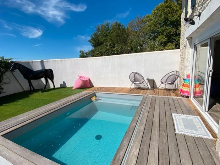 Angliers (17) : A vendre belle longère de caractère, de 9 pièces, entièrement rénovée, avec piscine et terrasse mobile, dans un environnement agréable, à seulement 15 minutes de la Rochelle. Une propriété spacieuse, exposée sud, d'une superficie habitable de 221 m², sur un terrain de 320 m². Elle comprend notamment :