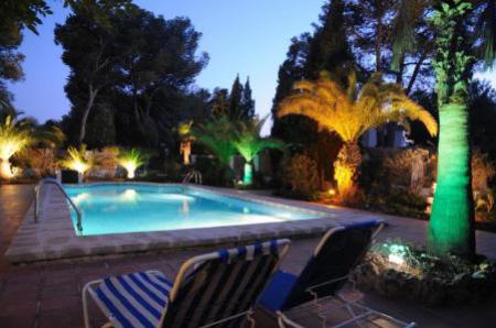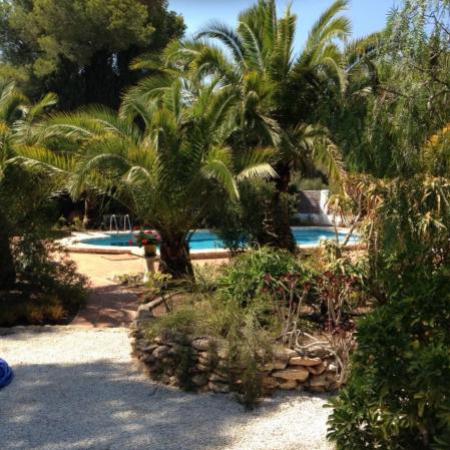 La villa mediterraneenne tient une parcelle de 1.970 m2 avec magnifique piscine (10x5), jardin romantique avec un systeme d'irrigation et illumination nocturne agreable, des plantes et des palmiers, cuisine d'ete entierement equipee avec barbecue couvert et salle a manger, douche et toilette.
