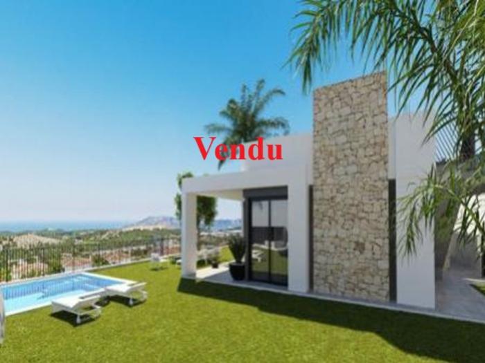La Nucia (03530) : Vente villa contemporaine de 3/4 pièces, d'une superficie habitable de 76 m² (89 m² en surface construite), à 9 km de la mer et des plages, sur les Hauteurs, aux portes de la ville d'Altea. Une belle propriété, avec piscine privée, terrasse et sa vue dégagée, sur une parcelle de terrain de 185 m². Elle comprend :