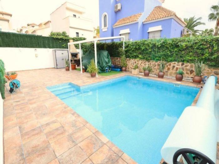 Vente superbe villa individuelle, sur trois niveaux, avec terrasse, jardin et piscine, d'une vaste superficie de 180 m² (Surface construite) située dans un quartier résidentiel (secteur las Filipinas), face à un parc, à 7 km de la mer et des plages d'Orihuela Costa. Une maison spacieuse, climatisée, avec une parcelle de 250 m². Elle comporte :