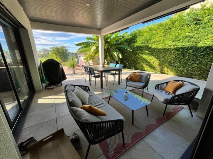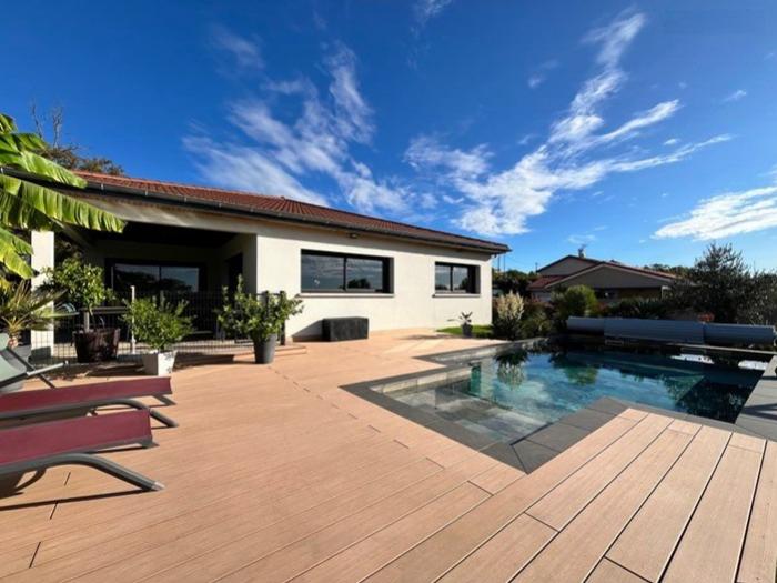 Polliat (01) : Vend maison moderne de plain-pied, F5, d'une superficie de 133 m², sur un terrain de 863 m². Située dans le quartier calme des Quatre Vents, à proximité des commerces et des écoles, cette propriété contemporaine de 2018, en parfait état, comprend :