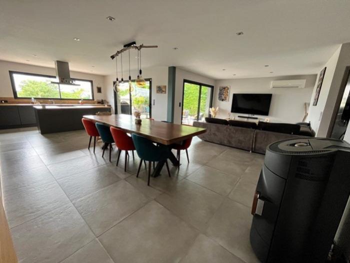 - 1 grande pièce à vivre de plus de 55 m², incluant un salon avec poêle à granulé, une salle à manger et une cuisine ouverte entièrement équipée