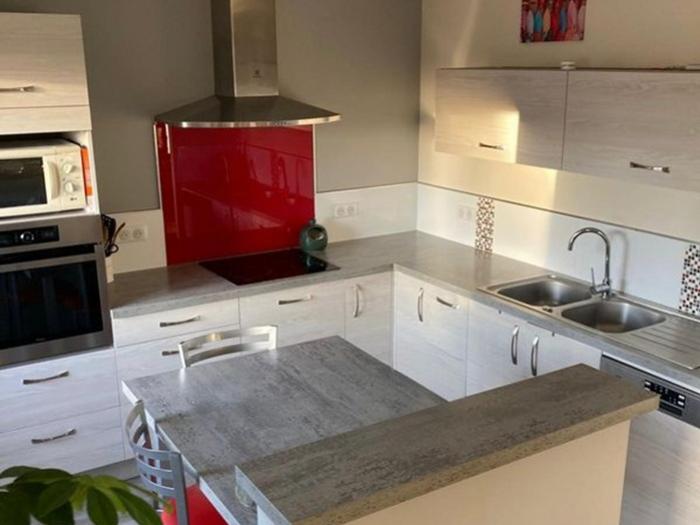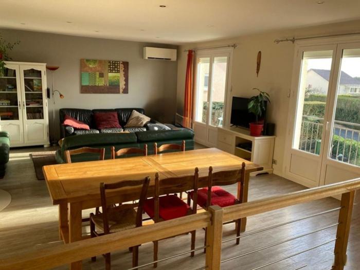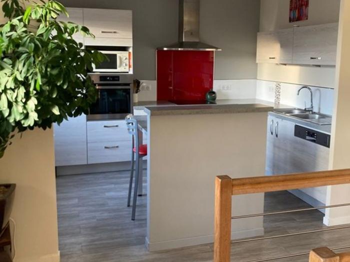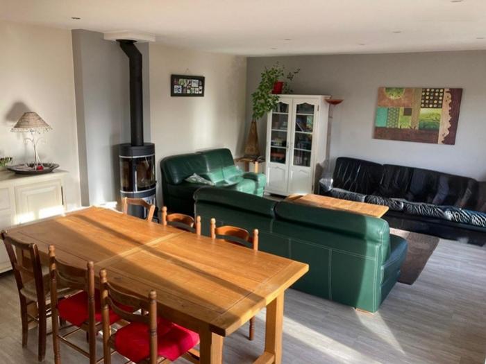 - Une grande pièce de vie lumineuse, avec poêle à bois (et climatisation), donnant sur une cuisine ouverte entièrement équipée