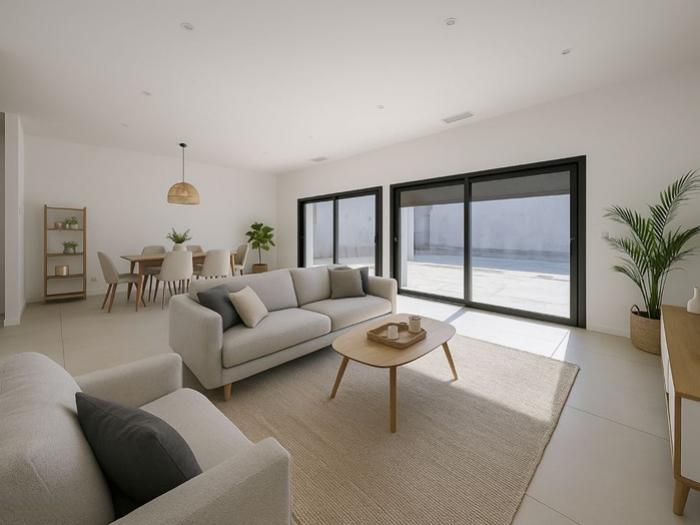 - Un séjour lumineux de 70 m² avec hauteur sous plafond exceptionnelle, ouvert sur la terrasse et la piscine,