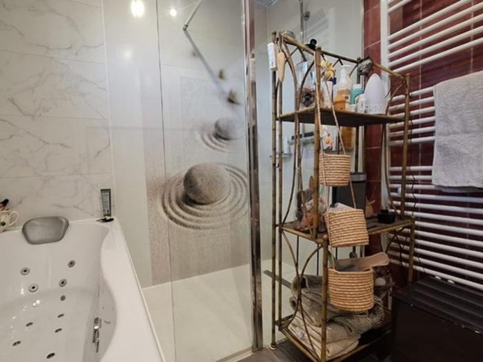 - Une salle d'eau avec douche italienne, baignoire balnéo et placard