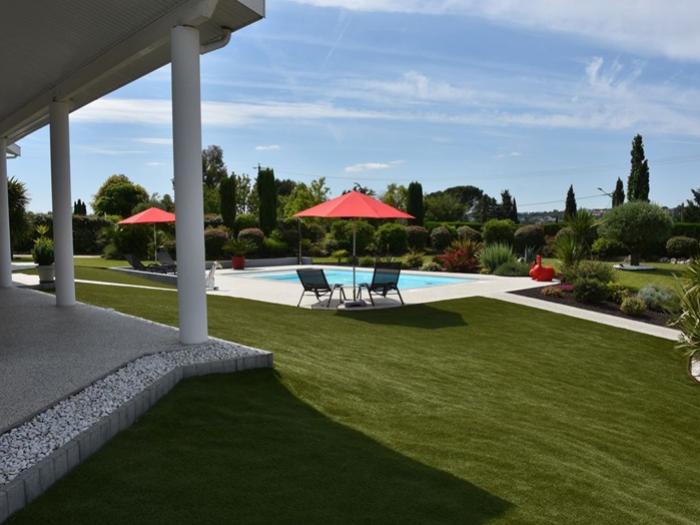 Equipements : porte d'entrée neuve, portail portillon ouverture neuve, porte de garages neuve, gazon synthétique, alarme et fibre optique.