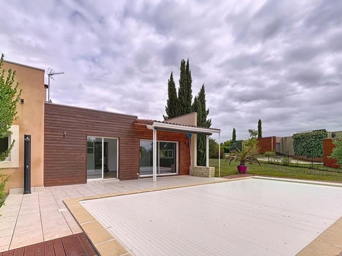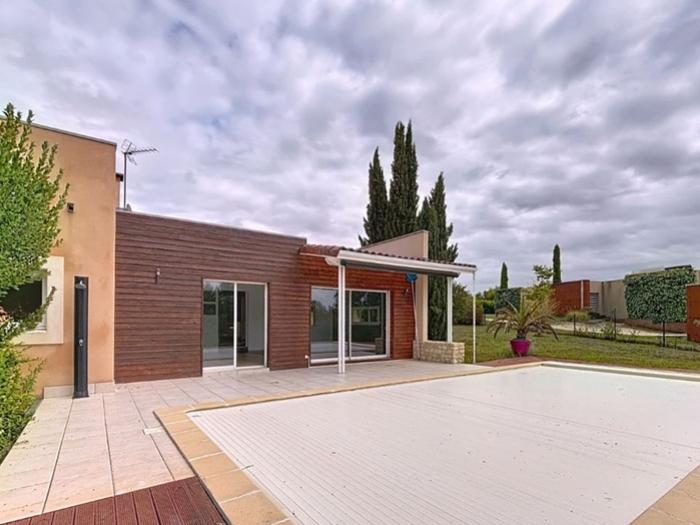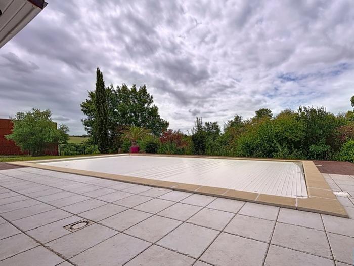 Preignan (32) : Particulier vend maison d’architecte contemporaine 7 pièces, avec piscine et sous-sol, située dans un environnement calme et verdoyant, à seulement 5 minutes d’Auch. Une propriété construite en 2008, offrant 170 m² habitables, implantée sur un terrain arboré de 3 000 m², sans vis-à-vis, et qui s’organise comme suit :