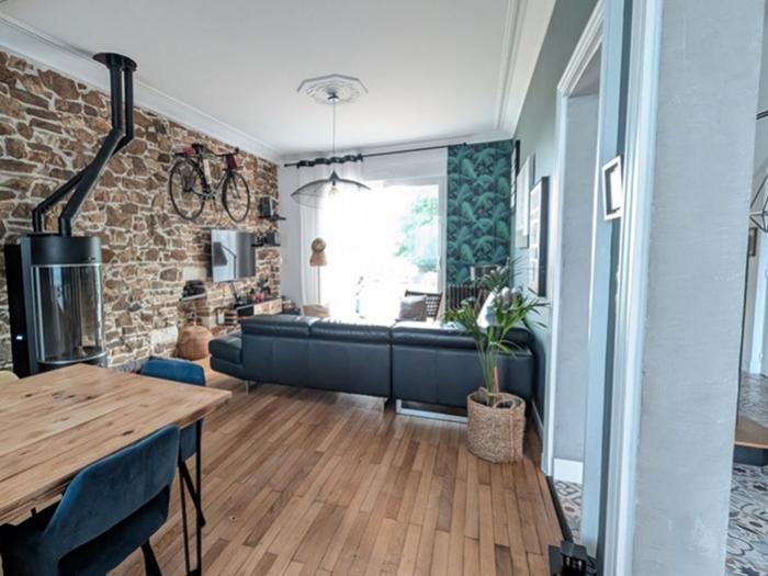 - Rez-de-chaussée : Un hall d’entrée donnant sur une pièce de vie de 40m² avec ses pierres apparentes et son parquet, une cuisine aménagée et équipée de 17m², un WC indépendant, ainsi qu'1 chambre parentale avec salle de bains et dressing.