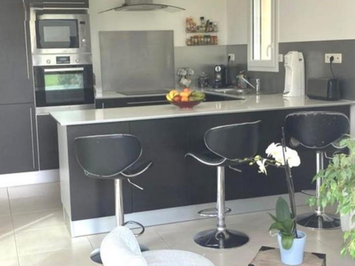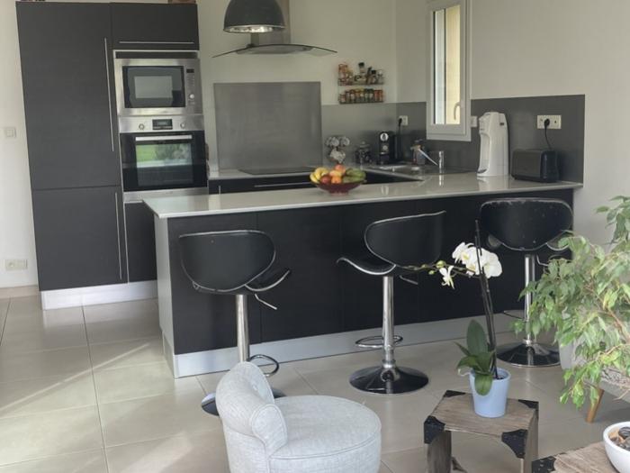 - Une cuisine ouverte avec bar de 7 m², équipée, fonctionnelle (nombreux rangements), prolongée d'une seconde partie de 12m².