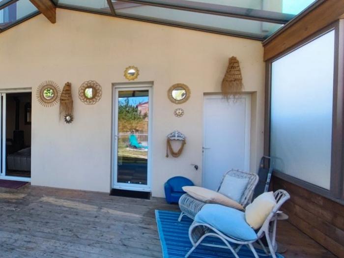 A l’extérieur, une grande terrasse en bois couverte, le jardin aménagé, clôturé, sans vis-à-vis, exposé sud-est, avec une partie paysagée avec piscine, et une partie potager avec un cabanon.