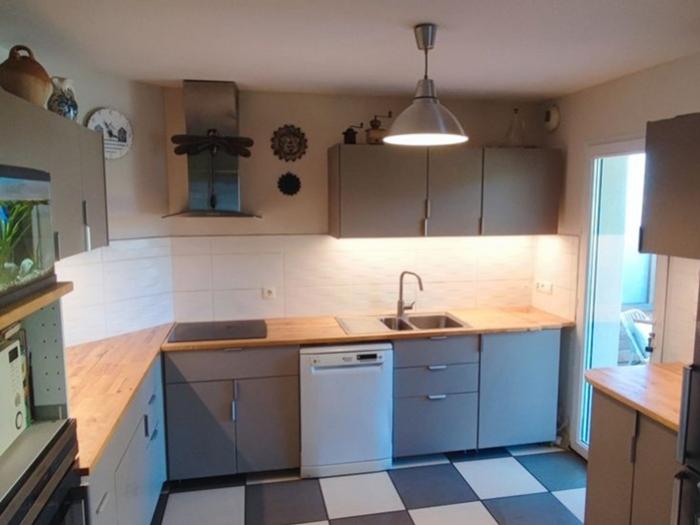 - Au rez-de-chaussée : Une spacieuse pièce de vie exposée est-ouest, avec un poêle à bois, une cuisine ouverte aménagée et équipée récente, ainsi que des toilettes séparées avec lave-mains, et un garage attenant.