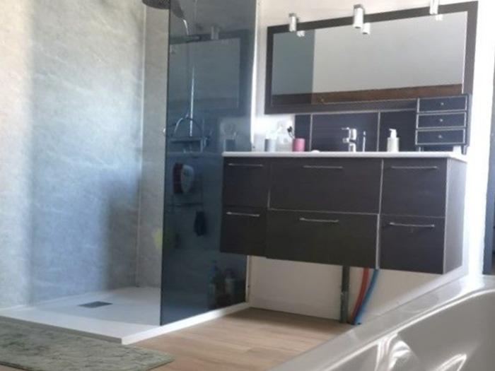 - Une salle de bain avec douche et baignoire