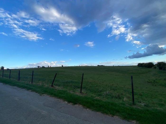 - A l’avant : Vue sur prairie et parking goudronné
