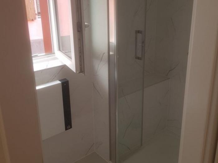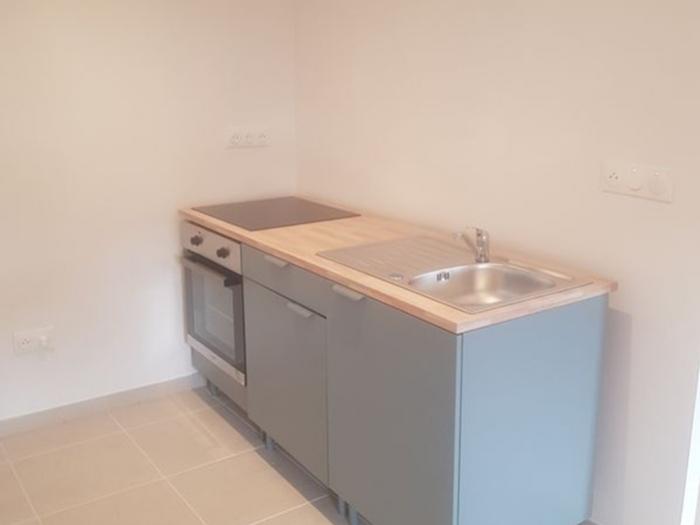 (Kitchenette neuve avec évier avec mitigeur et douchette, plaque induction 3 feux, four électrique, hotte et rangement haut prêt à être installé).