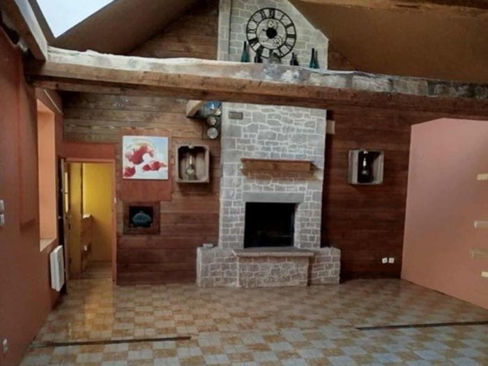 - Un grand salon chaleureux au plafond cathédrale et cheminée, ouvert sur une cuisine équipée au-dessus de laquelle se trouve une mezzanine aménagée en chambre d'amis.