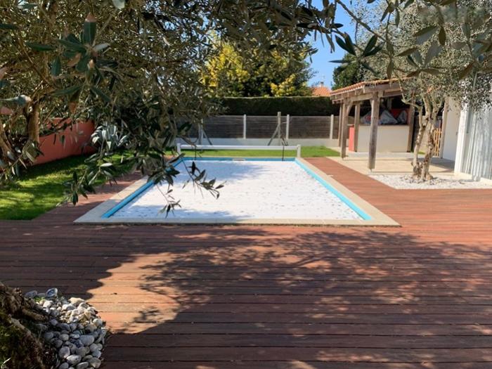 A l'extérieur, le jardin avec piscine 8x4 (traitement au sel, chauffée avec VR électrique), une cuisine d'été (BBQ intégré et évier), un terrain de pétanque, plusieurs terrasses dont une couverte, un local technique, un abri de jardin, et une partie stationnement pour 3 à 4 véhicules.