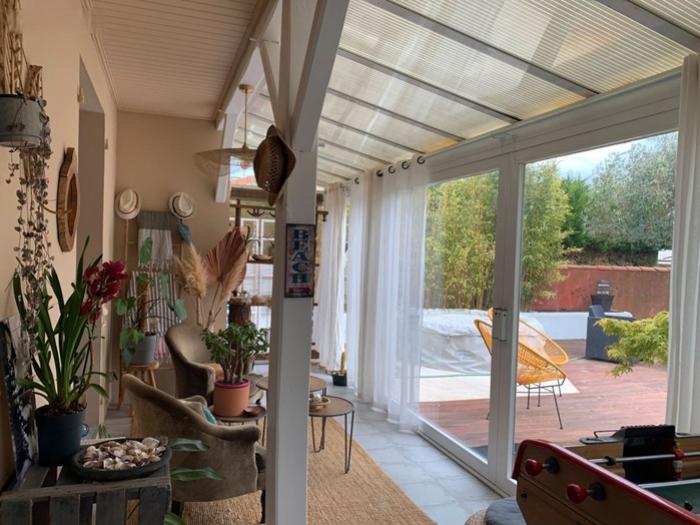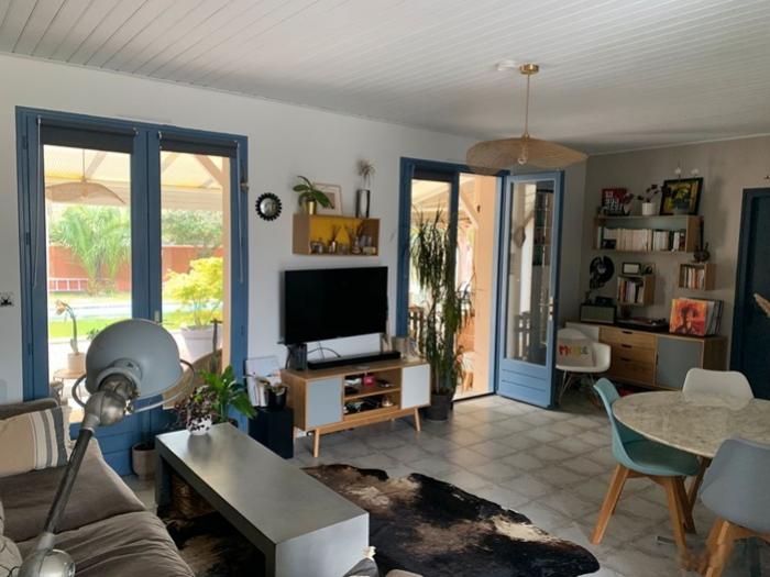 Angles (85) : Particulier vend maison F4 de plain-pied avec piscine, située au calme d'une impasse, à proximité du centre-ville et des commodités (10 minutes à pied). Une charmante propriété, exposée Sud, d'une superficie de 100 m² habitables, sur un terrain entièrement clôturé de 543 m². Elle comporte :