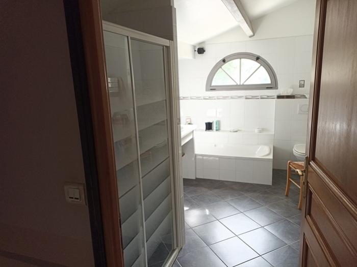 - Une salle de bain avec 2 vasques, douche, baignoire, placard et WC.