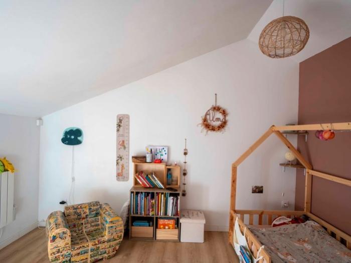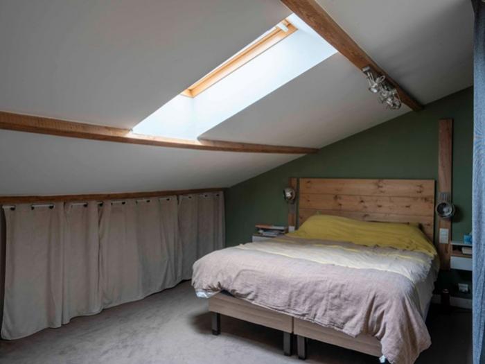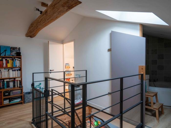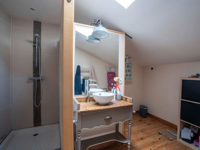- A l'étage, un palier desservant 2 chambres sous les toits (11 et 9,5 m²) avec placards sur mesure, un bureau de 8 m² pouvant faire office de chambre d'appoint, ainsi qu'une salle de bain avec baignoire d'angle et toilette.