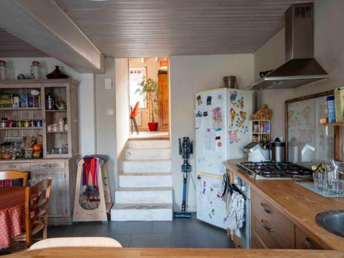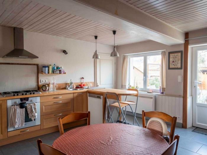 - Un demi-niveau plus bas, une cuisine équipée de près de 22 m², fonctionnelle et lumineuse, avec accès à une terrasse et au jardin récemment réaménagé, avec vue sur le clocher du village et un petit ruisseau en fond de parcelle.