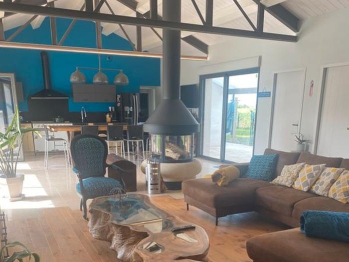 - Une grande pièce de vie d’environ 70 m² avec salon, séjour et cuisine aménagée et équipée (poutres métalliques apparentes et poêle moderne).