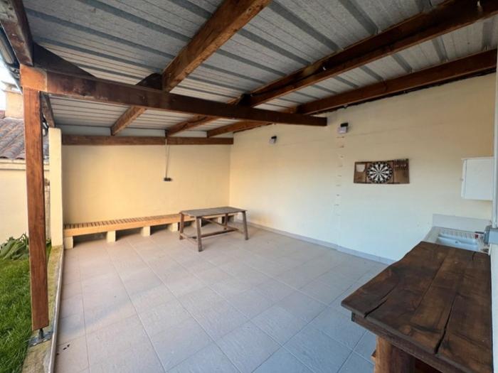 La maison dispose par ailleurs, d'un garage de 90 m², avec deux grandes ouvertures permettant de rentrer un camion ou des véhicules de grand gabarit, ainsi qu'une terrasse couverte de 30 m², donnant sur un agréable jardin de 40 m².