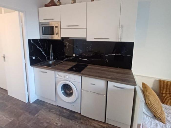 Un salon avec cuisine ouverte équipée, un espace dans l'entrée avec possibilité de mettre un lit une place ou des lits superposés (ancien appartement Pierre et vacances) donc espace optimisé.