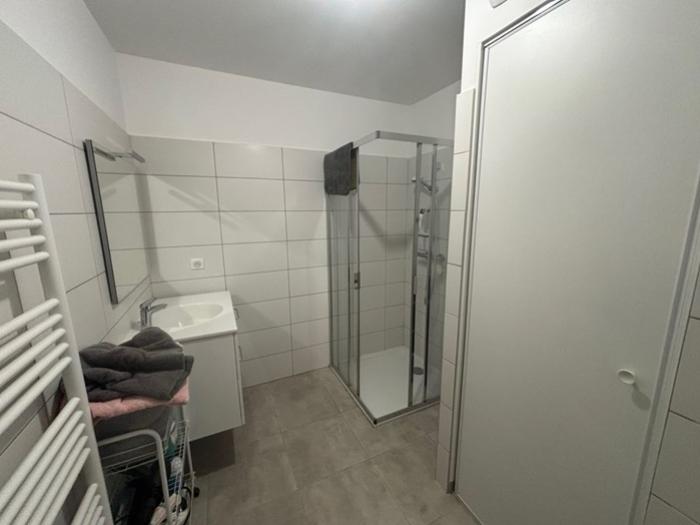 - Une salle d’eau moderne (cabine de douche, meuble vasque et WC)